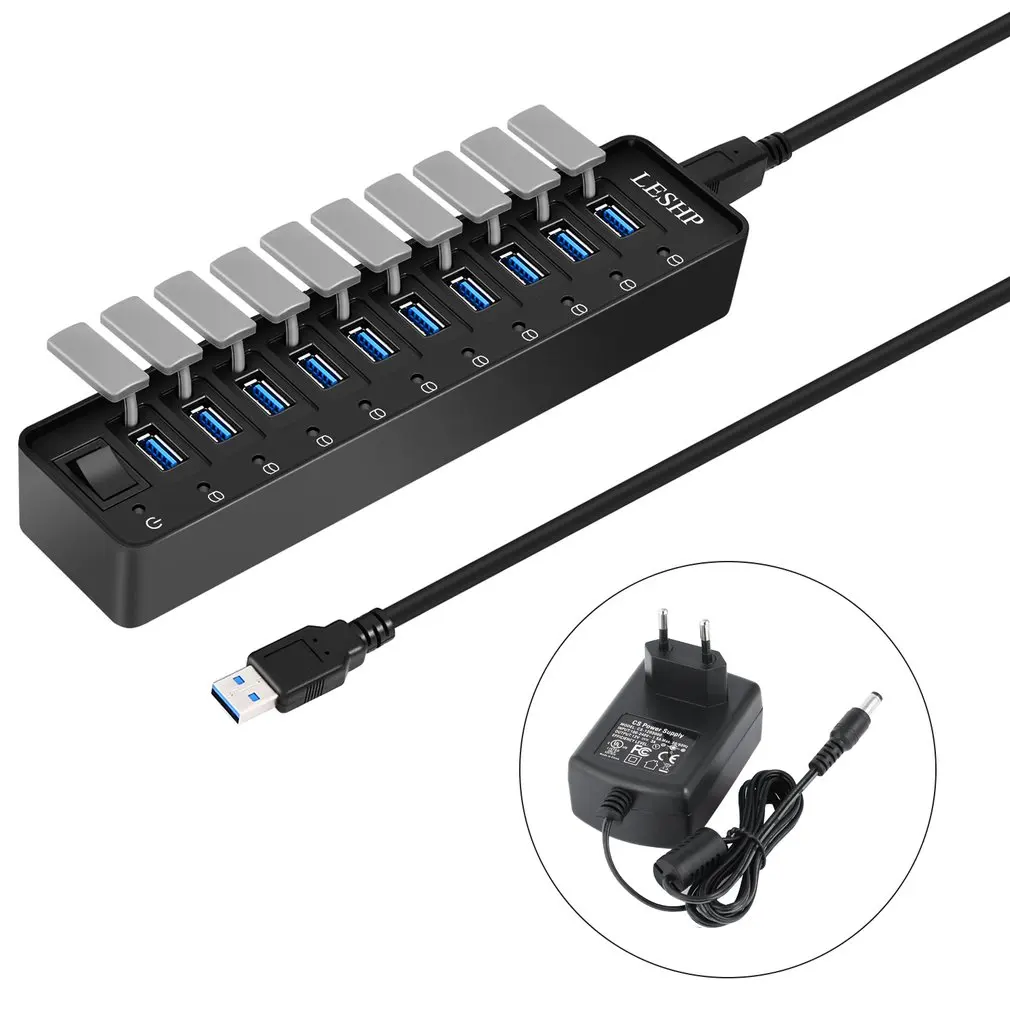 | 10 Ports USB 3.0 Hub High Speed 5Gbps USB 3.0 Data Hub Splitter with LEDs & Switch External Power Adapter for PC Laptop |