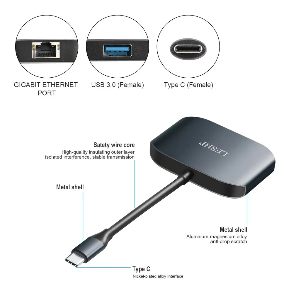 | Type C USB-C to Gigabit Ethernet & USB 3.0 HUB Convertor Cable Adapter RJ45 101001000 Mbps LAN Network Port Type-C Device |