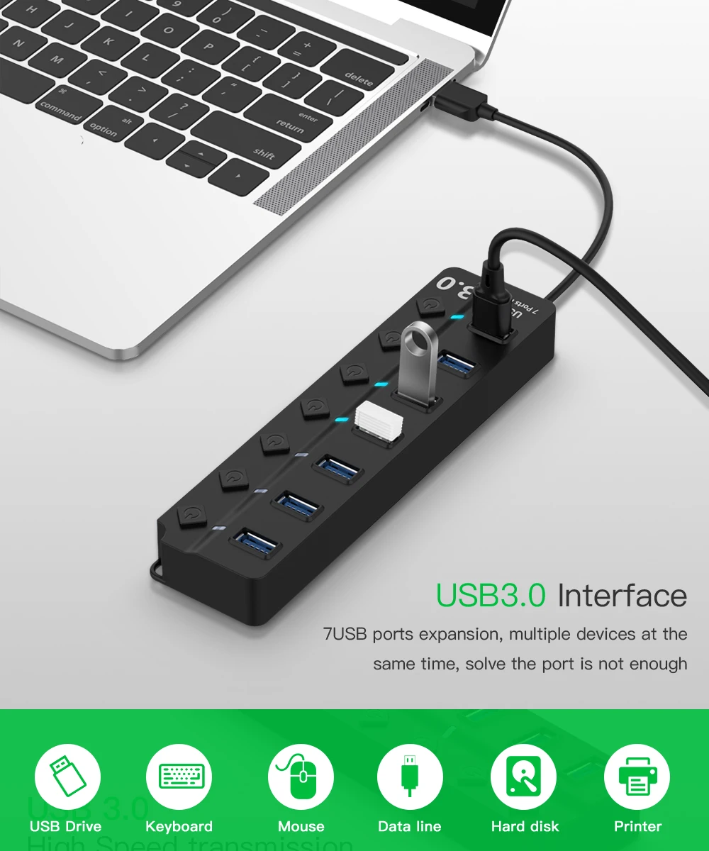 Plug & Play Portable Size 7 Ports USB 3.0 Hub OnOff Switches AC Adapter Cable Splitter for PC Laptop RF